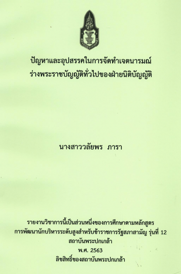 ปัญหาและอุปสรรคในการจัดทำเจตนารมณ์ร่างพระราชบัญญัติทั่วไปของฝ่ายนิติบัญญัติ / วลัยพร ภารา ; สถาบันพระปกเกล้า.