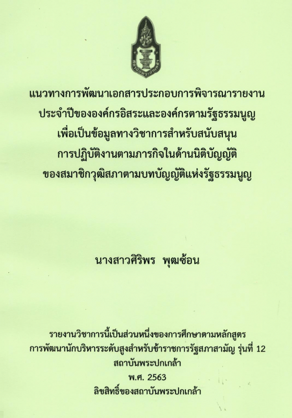 แนวทางการพัฒนาเอกสารประกอบการพิจารณารายงานประจำปีขององค์กรอิสระและองค์กรตามรัฐธรรมนูญเพื่อเป็นข้อมูลทางวิชาการสำหรับสนับสนุนการปฏิบัติงานตามภารกิจในด้านนิิติบัญญัติของสมาชิกวุฒิสภาตามบทบัญญัติแห่งรัฐธรรมนูญ / ศิริพร พุฒซ้อน ; สถาบันพระปกเกล้า.