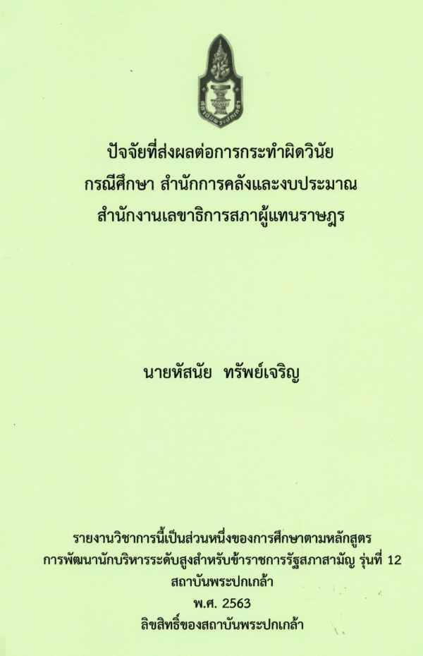 ปัจจัยที่ส่งผลต่อการกระทำผิดวินัย กรณีศึกษา สำนักการคลังและงบประมาณ สำนักงานเลขาธิการสภาผู้แทนราษฎร / หัสนัย ทรัพย์เจริญ ;