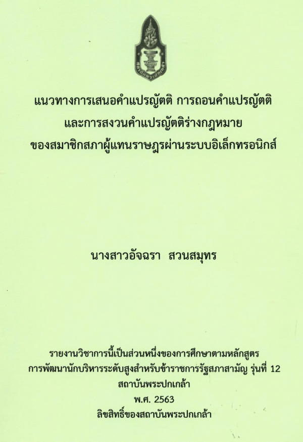 แนวทางการเสนอคำแปรญัตติ การถอนคำแปรญัตติ และการสงวนคำแปรญัตติร่างกฎหมายของสมาชิกสภาผู้แทนราษฎรผ่านระบบอิเล็กทรอนิกส์ / อัจฉรา สวนสมุทร ; สถาบันพระปกเกล้า.