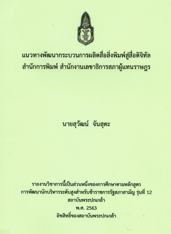 แนวทางพัฒนากระบวนการผลิตสื่อสิ่งพิมพ์สู่สื่อดิจิทัล สำนักการพิมพ์ สำนักงานเลขาธิการสภาผู้แทนราษฎร / สุวัฒน์ จันสุตะ ; สถาบันพระปกเกล้า.