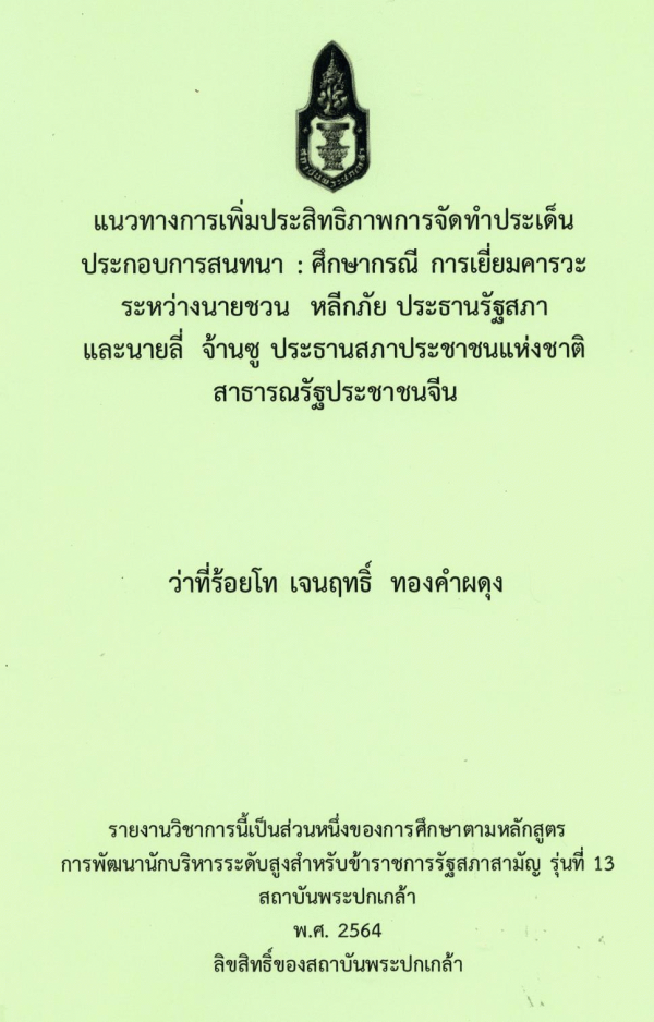 แนวทางการเพิ่มประสิทธิภาพการจัดทำประเด็นประกอบการสนทนา : ศึกษากรณี การเยี่ยมคารวะระหว่างนายชวน หลีกภัย ประธานรัฐสภา และนายลี่ จ้านซู ประธานสภาประชาชนแห่งชาติสาธารณรัฐประชาชนจีน / เจนฤทธิ์ ทองคำผดุง ; สถาบันพระปกเกล้า.