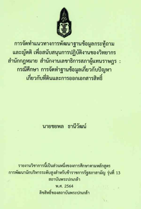 การจัดทำแนวทางการพัฒนาฐานข้อมูลกระทู้ถามและญัตติ เพื่อสนับสนุนการปฏิบัติงานของวิทยากร สำนักกฎหมาย สำนักงานเลขาธิการสภาผู้แทนราษฎร : กรณีศึกษา การจัดทำฐานข้อมูลเกี่ยวกับปัญหาเกี่ยวกับที่ดินและการออกเอกสารสิทธิ์ / ชยพล ธานีวัฒน์ ; สถาบันพระปกเกล้า.