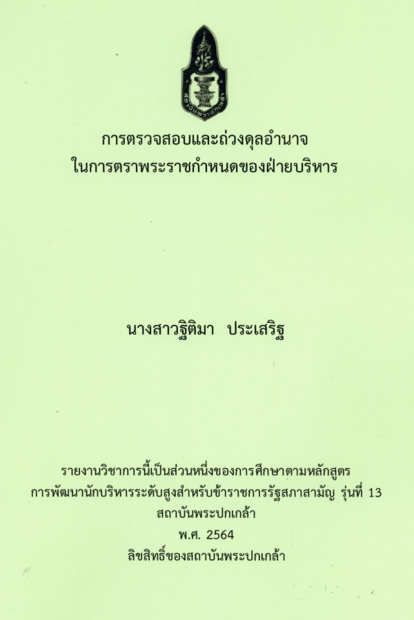 การตรวจสอบและถ่วงดุลอำนาจในการตราพระราชกำหนดของฝ่ายบริหาร / ฐิติมา ประเสริฐ ; สถาบันพระปกเกล้า.