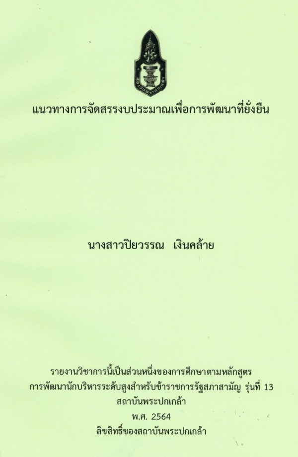 แนวทางการจัดสรรงบประมาณเพื่อการพัฒนาที่ยั่งยืน / ปิยวรรณ เงินคล้าย ; สถาบันพระปกเกล้า.