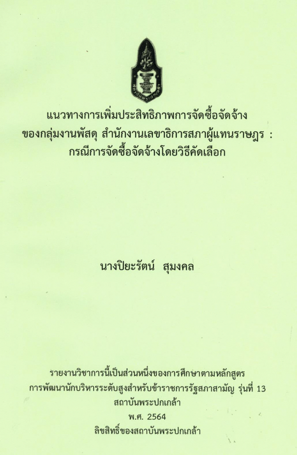 แนวทางการเพิ่มประสิทธิภาพการจัดซื้อจัดจ้างของกลุ่มงานพัสดุ สำนักงานเลขาธิการสภาผู้แทนราษฎร : กรณีการจัดซื้อจัดจ้างโดยวิธีคัดเลือก / ปิยะรัตน์ สุมงคล ; สถาบันพระปกเกล้า.