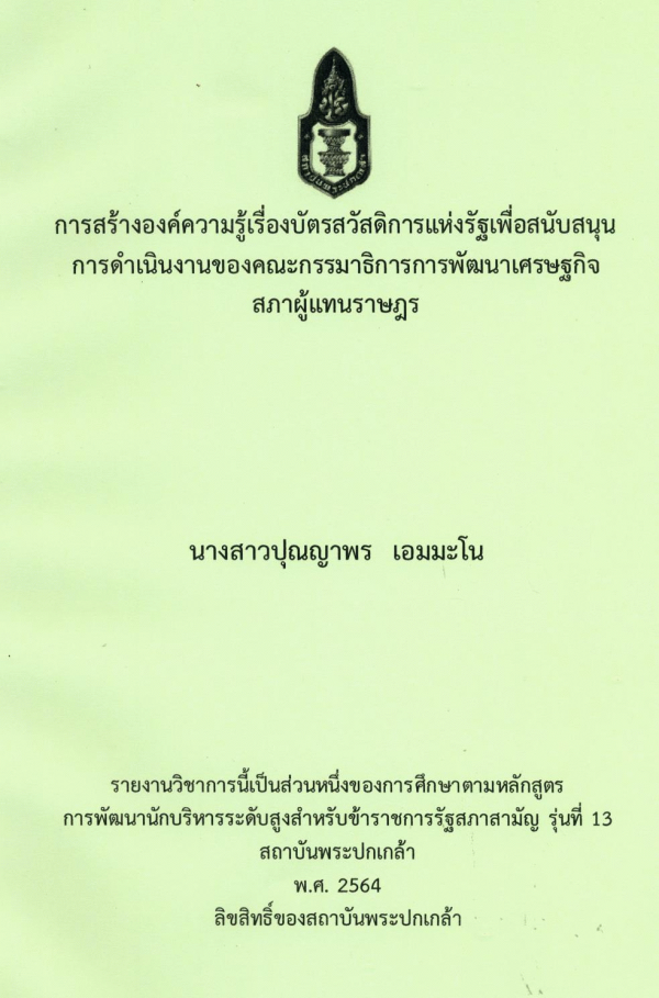 การสร้างองค์ความรู้เรื่องบัตรสวัสดิการแห่งรัฐเพื่อสนับสนุนการดำเนินงานของคณะกรรมาธิการการพัฒนาเศรษฐกิจ สภาผู้แทนราษฎร / ปุณญาพร เอมมะโน ; สถาบันพระปกเกล้า.