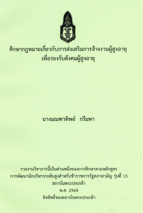 ศึกษากฎหมายเกี่ยวกับการส่งเสริมการจ้างงานผู้สูงอายุเพื่อรองรับสังคมผู้สูงอายุ / มณฑาทิพย์ กรีมหา ; สถาบันพระปกเกล้า.