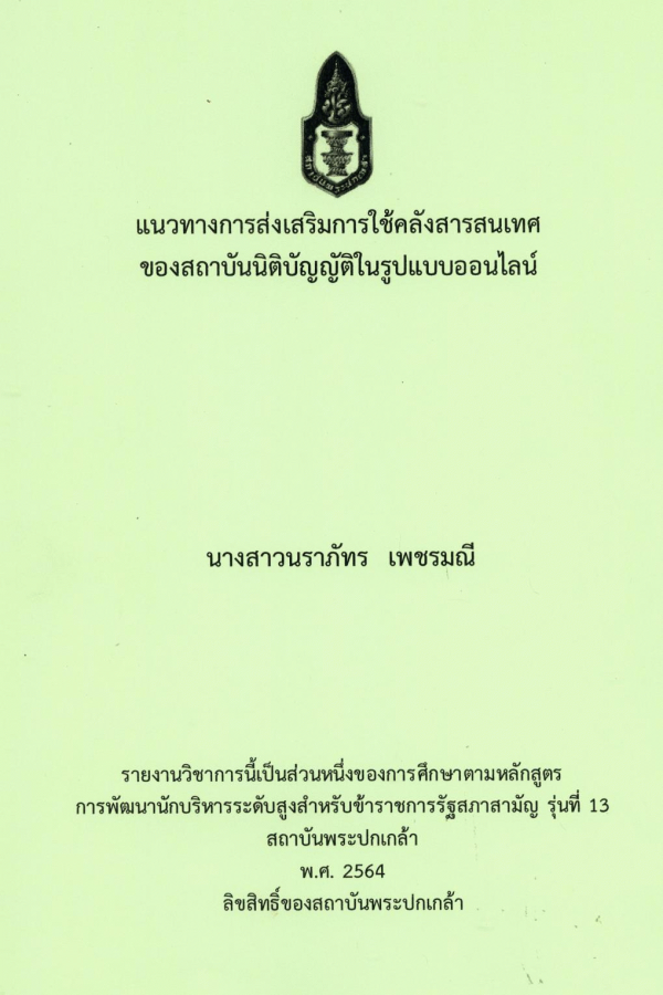 แนวทางการส่งเสริมการใช้คลังสารสนเทศของสถาบันนิติบัญญัติในรูปแบบออนไลน์ / นราภัทร เพชรมณี ; สถาบันพระปกเกล้า.