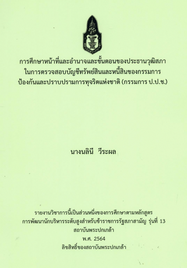 การศึกษาหน้าที่และอำนาจและขั้นตอนของประธานวุฒิสภาในการตรวจสอบบัญชีทรัพย์สินและหนี้สินของกรรมการป้องกันและปราบปรามการทุจริตแห่งชาติ (กรรมการ ป.ป.ช.) / นลินี วีระผล ; สถาบันพระปกเกล้า.