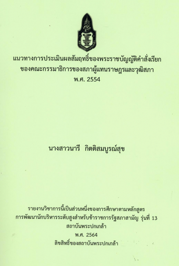 แนวทางการประเมินผลสัมฤทธิ์ของพระราชบัญญัติคำสั่งเรียกของคณะกรรมาธิการของสภาผู้แทนราษฎรและวุฒิสภา พ.ศ. 2554 / นารี กิตติสมบูรณ์สุข ; สถาบันพระปกเกล้า.