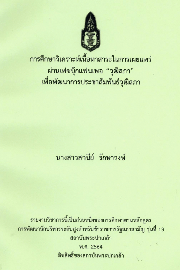 การศึกษาวิเคราะห์เนื้อหาสาระในการเผยแพร่ผ่านเฟซบุ๊กแฟนเพจ "วุฒิสภา" เพื่อพัฒนาการประชาสัมพันธ์วุฒิสภา / สวนีย์ รักษาวงษ์ ; สถาบันพระปกเกล้า.