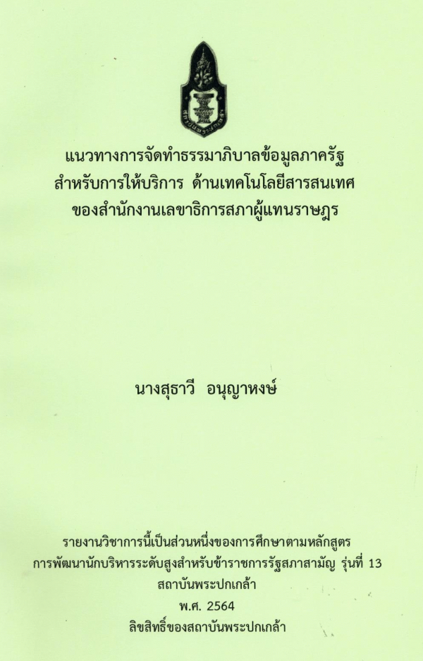 แนวทางการจัดทำธรรมาภิบาลข้อมูลภาครัฐสำหรับการให้บริการ ด้านเทคโนโลยีสารสนเทศของสำนักงานเลขาธิการสภาผู้แทนราษฎร / สุธาวี อนุญาหงษ์ ; สถาบันพระปกเกล้า.