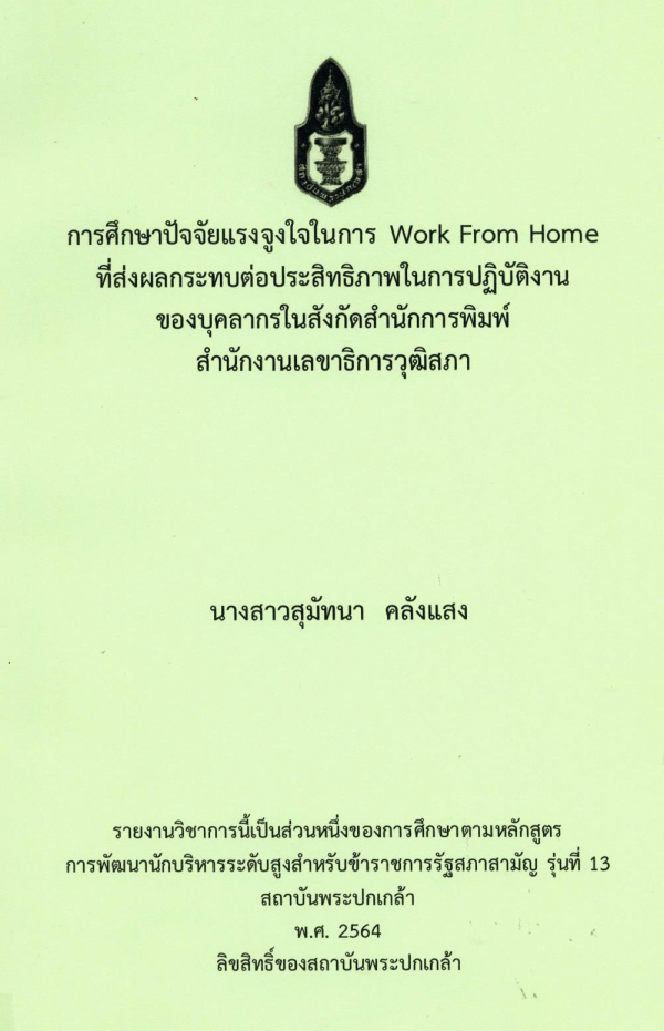 การศึกษาปัจจัยแรงจูงใจในการ Work From Home ที่ส่งผลกระทบต่อประสิทธิภาพในการปฏิบัติงานของบุคลากรในสังกัดสำนักการพิมพ์ สำนักงานเลขาธิการสภาผู้แทนราษฎร / สุมัทนา คลังแสง ; สถาบันพระปกเกล้า.
