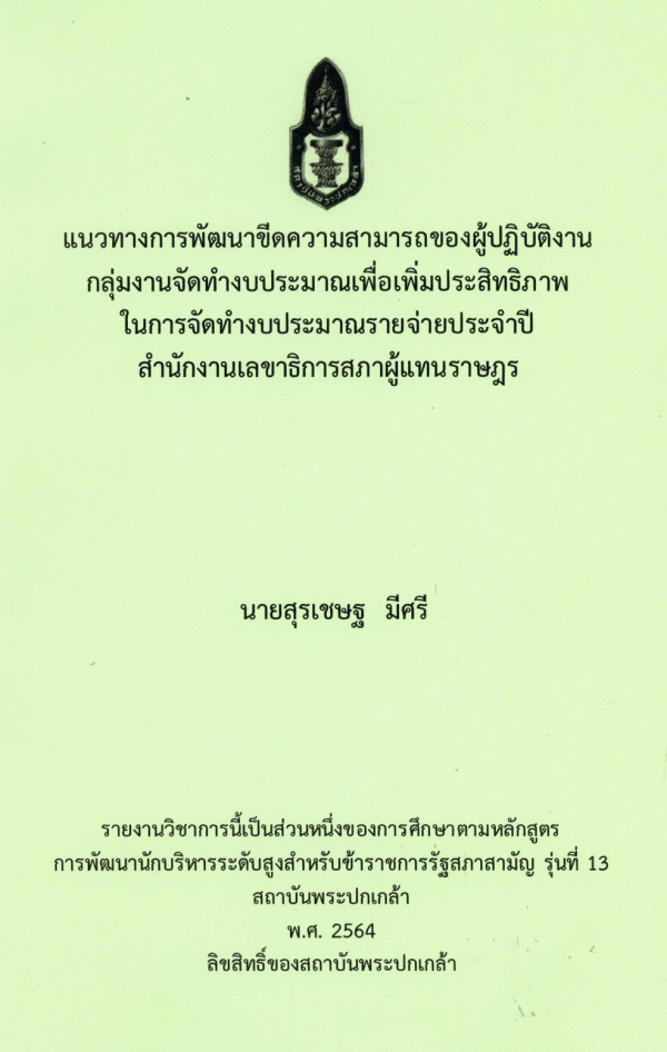 แนวทางการพัฒนาขีดความสามารถของผู้ปฏิบัติงานกลุ่มงานจัดทำงบประมาณเพื่อเพิ่มประสิทธิภาพในการจัดทำงบประมาณรายจ่ายประจำปีสำนักงานเลขาธิการสภาผู้แทนราษฎร / สุรเชษฐ มีศรี ; สถาบันพระปกเกล้า.