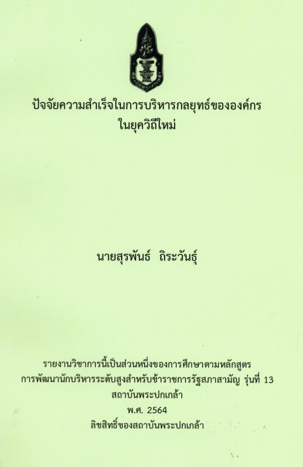 ปัจจัยความสำเร็จในการบริหารกลยุทธ์ขององค์กรในยุควิถีใหม่ / สุรพันธ์ ถิระวันธุ์ ; สถาบันพระปกเกล้า.