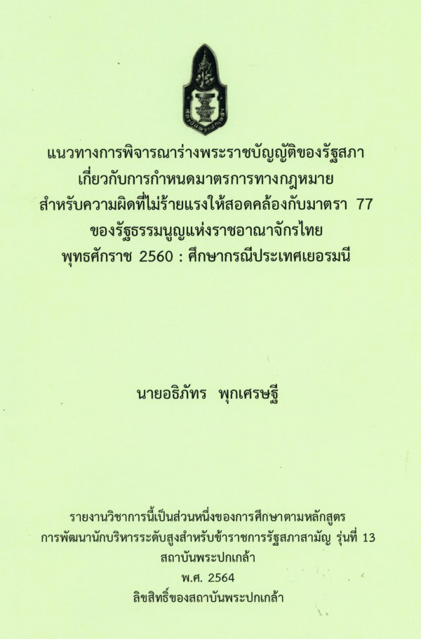 แนวทางการพิจารณาร่างพระราชบัญญัติของรัฐสภาเกี่ยวกับการกำหนดมาตรการทางกฎหมายสำหรับความผิดที่ไม่ร้ายแรงให้สอดคล้องกับมาตรา 77 ของรัฐธรรมนูญแห่งราชอาณาจักรไทย พุทธศักราช 2560 : ศึกษากรณีประเทศเยอรมนี / อธิภัทร พุกเศรษฐี ; สถาบันพระปกเกล้า.