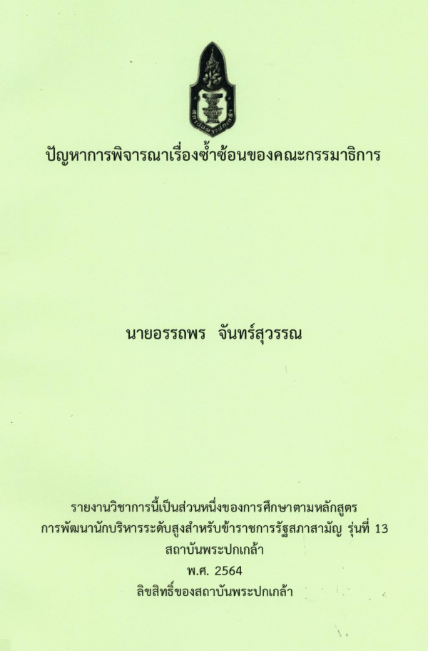 ปัญหาการพิจารณาเรื่องซ้ำซ้อนของคณะกรรมาธิการ / อรรถพร จันทร์สุวรรณ ; สถาบันพระปกเกล้า.