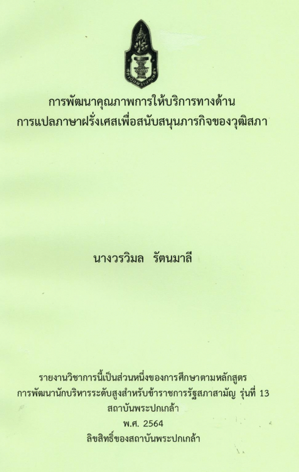 การพัฒนาคุณภาพการให้บริการทางด้านการแปลภาษาฝรั่งเศสเพื่อสนับสนุนภารกิจของวุฒิสภา / วรวิมล รัตนมาลี ; สถาบันพระปกเกล้า.