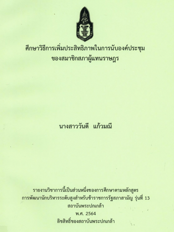 ศึกษาวิธีการเพิ่มประสิทธิภาพในการนับองค์ประชุมของสมาชิกสภาผู้แทนราษฎร / วันดี แก้วมณี ; สถาบันพระปกเกล้า.