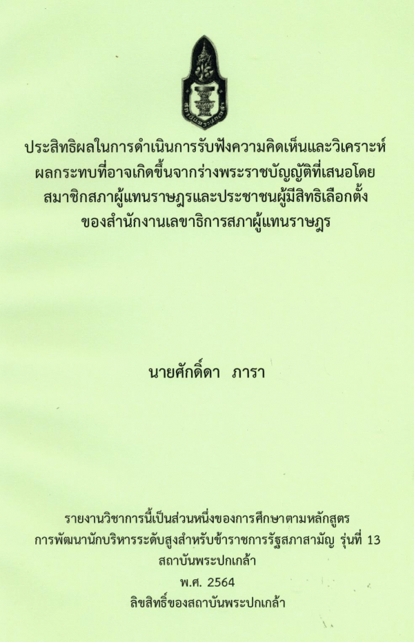 ประสิทธิผลในการดำเนินการรับฟังความคิดเห็นและวิเคราะห์ผลกระทบที่อาจเกิดขึ้นจากร่างพระราชบัญญัติที่เสนอโดยสมาชิกสภาผู้แทนราษฎรและประชาชนผู้มีสิทธิเลือกตั้งของสำนักงานเลขาธิการสภาผู้แทนราษฎร / ศักดิ์ดา ภารา ; สถาบันพระปกเกล้า.