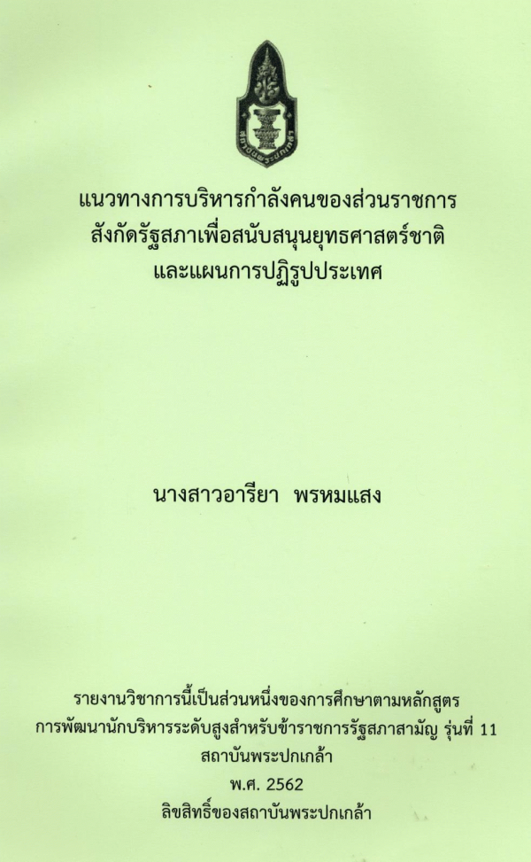 แนวทางการบริหารกำลังคนของส่วนราชการสังกัดรัฐสภาเพื่อสนับสนุนยุทธศาสตร์ชาติและแผนการปฏิรูปประเทศ / อารียา พรหมแสง ; สถาบันพระปกเกล้า.