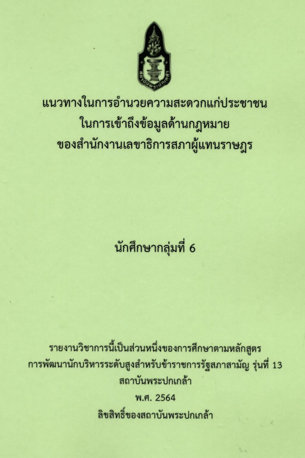 นักศึกษาสถาบันพระปกเกล้า หลักสูตรการพัฒนานักบริหารระดับสูง สำหรับข้าราชการรัฐสภาสามัญ รุ่นที่ 13 กลุ่มที่ 6, มนันญา ภู่แก้ว, มานิดา สารพัฒน์, ยอดยิ่ง บัณฑิตทัศนานนท์, ยูลัด ดำริห์เลิศ, รังสิทธิ์ วรรณกิจ, รังสิมา จีนเจริญ, รัชนีย์ ต้นทอง, รัฐปสันน์ พันธุลี, รุ่งรัฐ ลิลา, เรณุมาศ รักษาแก้ว, วรนาฎ ทิพยชล and สถาบันพระปกเกล้า. แนวทางในการอำนวยความสะดวกแก่ประชาชนในการเข้าถึงข้อมูลด้านกฎหมาย ของสำนักงานเลขาธิการสภาผู้แทนราษฎร. กรุงเทพฯ: สถาบันพระปกเกล้า. 2564.