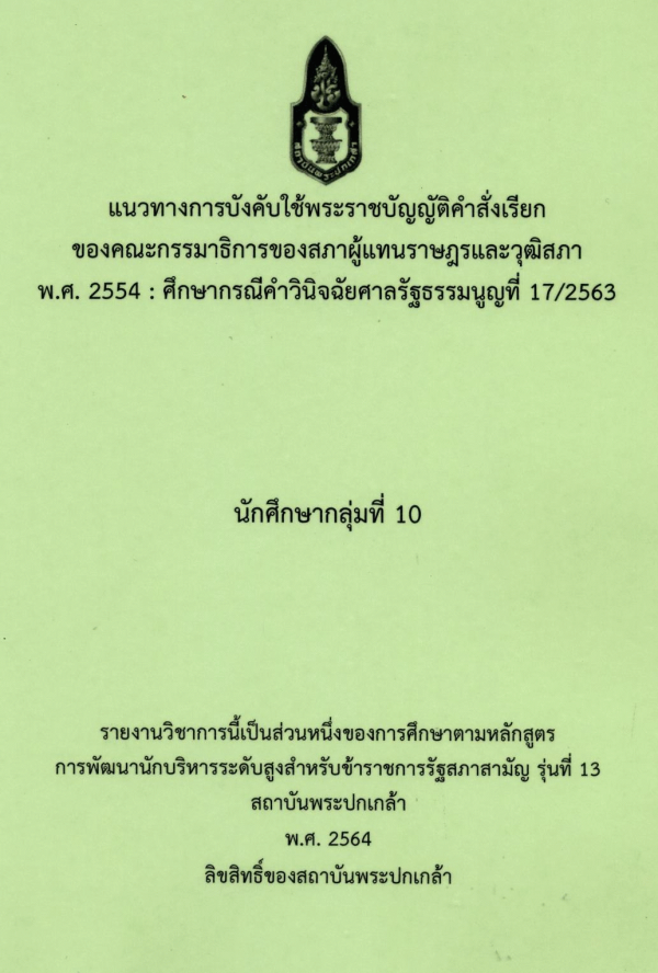 นักศึกษาสถาบันพระปกเกล้า หลักสูตรการพัฒนานักบริหารระดับสูง สำหรับข้าราชการรัฐสภาสามัญ รุ่นที่ 13 กลุ่มที่ 10, กรรณิกา พัสระ, คณฉัตร สุวิทวัส, ฉัตรชัย ก่อเกิด, ฐิติมา ประเสริฐ, ณัฐพล นันทมานพ ประชุมญาติ, เทวินทร์ เกษตระกูล, ธนเดช เขตจัตุรัส, ธีรยุทธ ตั้งบุญเกษม, นงเยาว์ ชัยวงค์ and สถาบันพระปกเกล้า. แนวทางการบังคับใช้พระราชบัญญัติคำสั่งเรียกของคณะกรรมาธิการของสภาผู้แทนราษฎรและวุฒิสภา พ.ศ. 2554 : ศึกษากรณีคำวินิจฉัยศาลรัฐธรรมนูญที่ 17/2563. กรุงเทพฯ: สถาบันพระปกเกล้า. 2564.