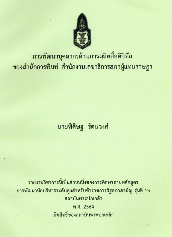 การพัฒนาบุคลากรด้านการผลิตสื่อดิจิทัลของสำนักการพิมพ์ สำนักงานเลขาธิการสภาผู้แทนราษฎร / พิศิษฐ รัตนวงศ์ ; สถาบันพระปกเกล้า.