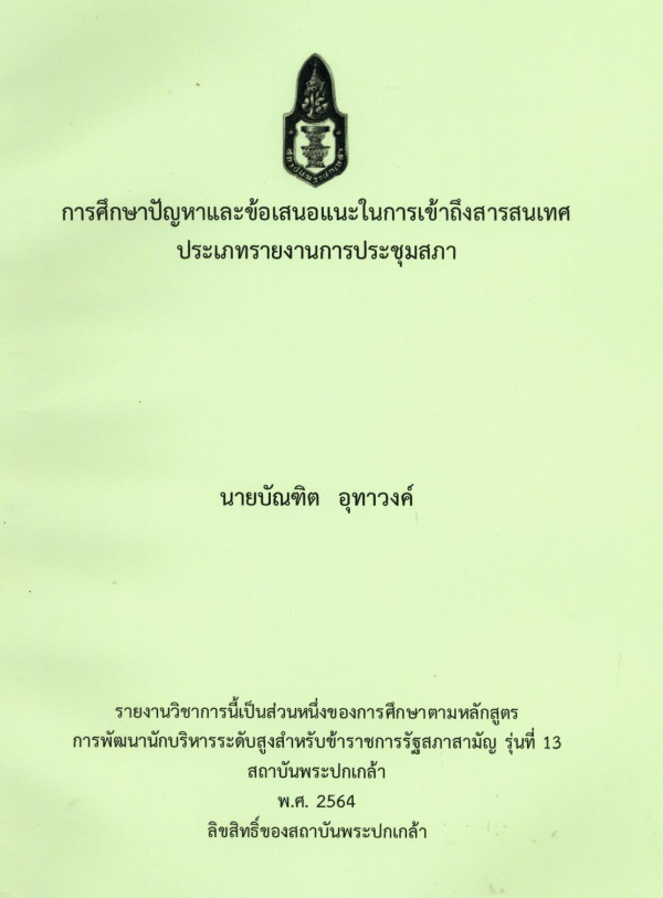 การศึกษาปัญหาและข้อเสนอแนะในการเข้าถึงสารสนเทศประเภทรายงานการประชุมสภา / บัณฑิต อุทาวงค์ ; สถาบันพระปกเกล้า.