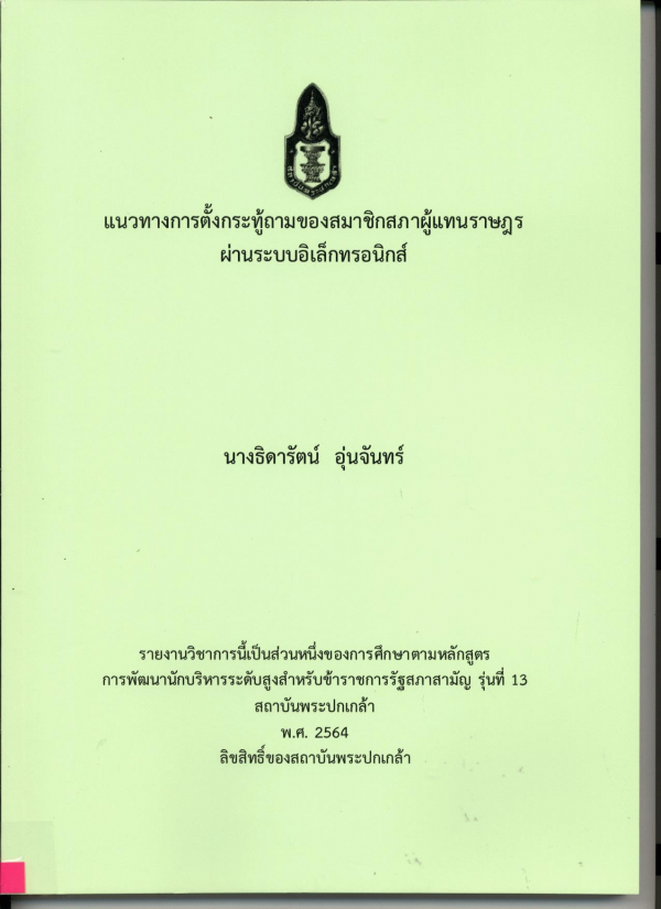 แนวทางการตั้งกระทู้ถามของสมาชิกสภาผู้แทนราษฎรผ่านระบบอิเล็กทรอนิกส์ / ธิดารัตน์ อุ่นจันทร์ ; สถาบันพระปกเกล้า.