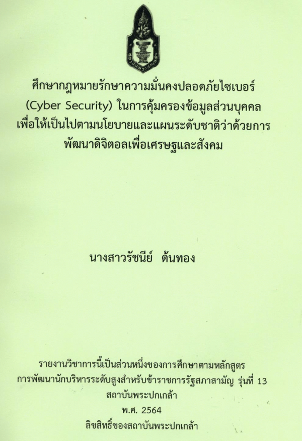 ศึกษากฎหมายรักษาความมั่นคงปลอดภัยไซเบอร์ (Cyber Security) ในการคุ้มครองข้อมูลส่วนบุคคลเพื่อให้เป็นไปตามนโยบายและแผนระดับชาติว่าด้วยการพัฒนาดิจิตอลเพื่อเศรษฐกิจและสังคม / รัชนีย์ ต้นทอง ; สถาบันพระปกเกล้า.