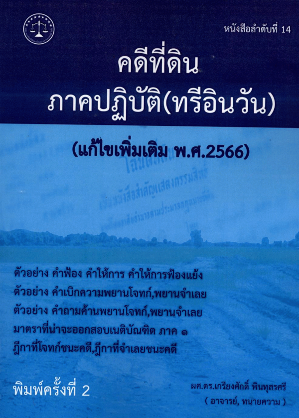 - คดีที่ดิน ภาคปฏิบัติ (ทรีอินวัน) แก้ไขเพิ่มเติม พ.ศ. 2566) ตัวอย่าง คำฟ้อง คำให้การ คำให้การฟ้องแย้ง ตัวอย่าง คำเบิกความพยามโจทก์, พยานจำเลย ตัวอย่าง คำถามค้านพยานโจทก์, พยานจำเลย มาตราที่น่าจะออกสอบเนติบัณฑิต ภาค 1 ฎีกาที่โจทก์ชนะคดี, ฎีกาที่จำเลยชนะคดี [Cover title]