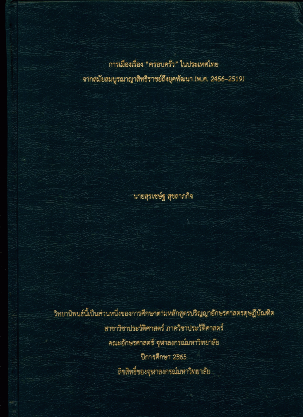 การเมืองเรื่อง "ครอบครัว" ในประเทศไทยจากสมัยสมบูรณาญาสิทธิราชย์ถึงยุคพัฒนา (พ.ศ.2456-2519) / สุรเชษฐ์ สุขลาภกิจ.