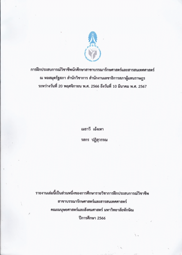 การฝึกประสบการณ์วิชาชีพนักศึกษาสาขาบรรณารักษศาสตร์และสารสนเทศศาสตร์ ณ หอสมุดรัฐสภา สำนักวิชาการ สำนักงานเลขาธิการสภาผู้แทนราษฎร ระหว่างวันที่ 20 พฤศจิกายน พ.ศ. 2566 ถึงวันที่ 10 มีนาคม พ.ศ. 2567 / เมธาวี เฉ้งเหา, รสกร ปฏิสุวรรณ.