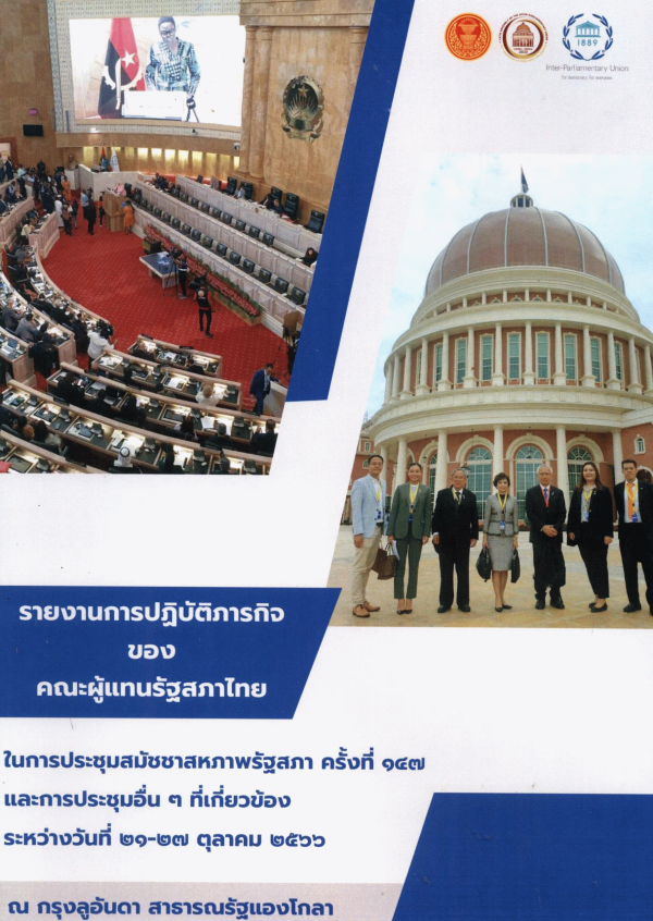 รายงานการปฏิบัติภารกิจของคณะผู้แทนรัฐสภาไทยในการประชุมสมัชชาสหภาพรัฐสภา ครั้งที่ 147 และการประชุมอื่น ๆ ที่เกี่ยวข้อง (The 147th Assembly of the Inter-Parliamentary Union and Related Meethings) ระหว่างวันที่ 21 - 27 ตุลาคม 2566 ณ กรุงลูอันดา สาธารณรัฐแองโกลา / กลุ่มงานสหภาพรัฐสภา สำนักองค์การรัฐสภาระหว่างประเทศ สำนักงานเลขาธิการสภาผู้แทนราษฎร.
