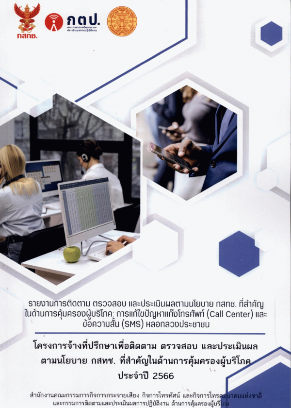 รายงานการติดตาม ตรวจสอบ และประเมินผลตามนโยบาย กสทช. ที่สำคัญในด้านการคุ้มครองผู้บริโภค : การแก้ไขปัญหาแก๊งโทรศัพท์ (Call Center) และข้อความสั้น (SMS) หลอกลวงประชาชน : โครงการจ้างที่ปรึกษาเพื่อติดตาม ตรวจสอบ และประเมินผลตามนโยบาย กสทช. ที่สำคัญในด้านการคุ้มครองผู้บริโภค ประจำปี 2566 / คณะกรรมการติดตาม และประเมินผลการปฏิบัติงาน (กตป.) สำนักงานคณะกรรมการกิจการกระจายเสียง กิจการโทรทัศน์ และกิจการโทรคมนาคมแห่งชาติ (สำนักงาน กสทช.).
