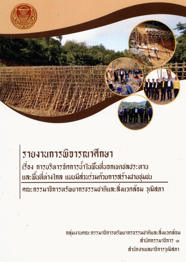 รายงานการพิจารณาศึกษา เรื่อง การบริหารจัดการน้ำในพื้นที่นอกเขตชลประทานและพื้นที่ห่างไกล แบบมีส่วนร่วมด้วยการสร้างฝายชุมชน คณะกรรมาธิการทรัพยากรธรรมชาติและสิ่งแวดล้อม วุฒิสภา / กลุ่มงานคณะกรรมาธิการทรัพยากรธรรมชาติและสิ่งแวดล้อม สำนักกรรมาธิการ 1 สำนักงานเลขาธิการวุฒิสภา.