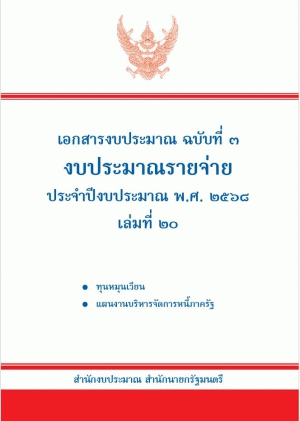 เอกสารงบประมาณ ฉบับที่ 3 งบประมาณรายจ่าย ประจำปีงบประมาณ พ.ศ. 2568 เล่มที่ 20 ทุนหมุนเวียน แผนงานบริหารจัดการหนี้ภาครัฐ / สำนักงบประมาณ.