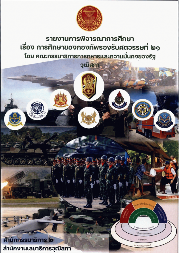 รายงานการพิจารณาการศึกษา เรื่อง การศึกษาของกองทัพรองรับศตวรรษที่ 21 โดย คณะกรรมาธิการการทหารและความมั่นคงของรัฐ วุฒิสภา / คณะกรรมาธิการการทหารและความมั่นคงของรัฐ วุฒิสภา สำนักกรรมาธิการ 2 สำนักงานเลขาธิการวุฒิสภา.