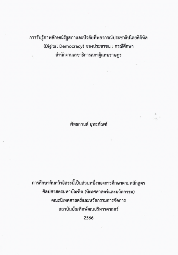 การรับรู้ภาพลักษณ์รัฐสภาและปัจจัยที่พยากรณ์ประชาธิปไตยดิจิทัล (Digital Democracy) ของประชาชน : กรณีศึกษา สำนักงานเลขาธิการสภาผู้แทนราษฎร / พัทธกานต์ ยุทธภัณฑ์.
