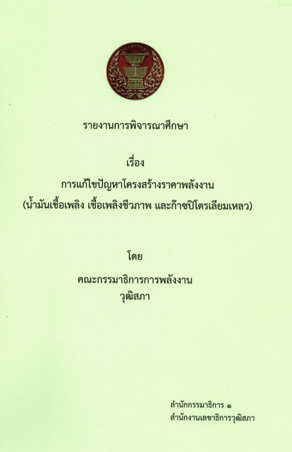 รายงานการพิจารณาศึกษา เรื่อง การแก้ไขปัญหาโครงสร้างราคาพลังงาน (น้ำมันเชื้อเพลิง เชื้อเพลิงชีวภาพ และก๊าซปิโตรเลียมเหลว) โดย คณะกรรมาธิการการพลังงาน วุฒิสภา / สำนักกรรมาธิการ 1 สำนักงานเลขาธิการวุฒิสภา.
