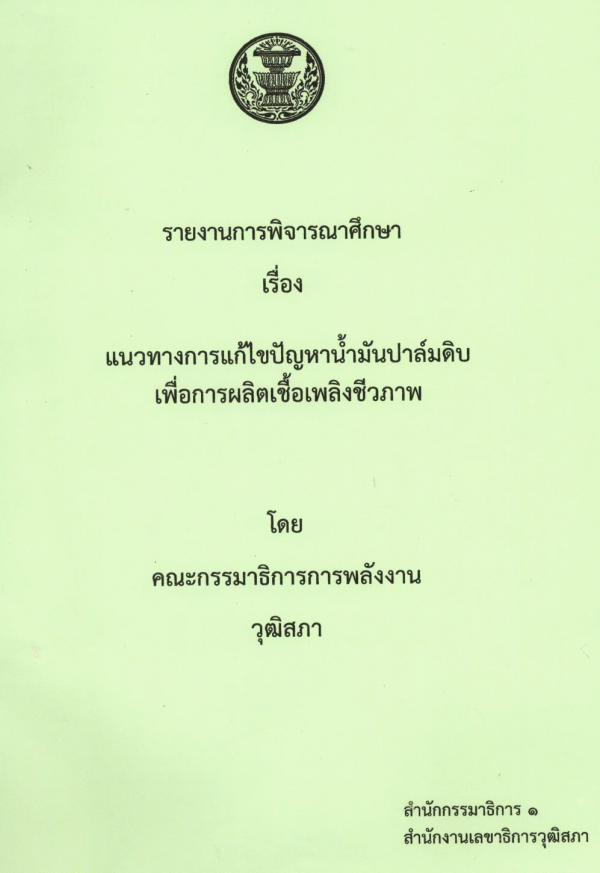 รายงานการพิจารณาศึกษา เรื่อง แนวทางการแก้ไขปัญหาน้ำมันปาล์มดิบเพื่อการผลิตเชื้อเพลิงชีวภาพ โดย คณะกรรมาธิการการพลังงาน วุฒิสภา / สำนักกรรมาธิการ 1 สำนักงานเลขาธิการวุฒิสภา.