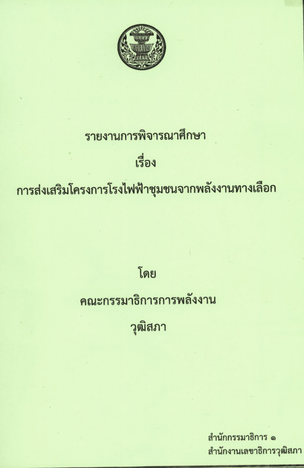 รายงานการพิจารณาศึกษา เรื่อง การส่งเสริมโครงการโรงไฟฟ้าชุมชนจากพลังงานทางเลือก โดย คณะกรรมาธิการการพลังงาน วุฒิสภา / สำนักกรรมาธิการ 1 สำนักงานเลขาธิการวุฒิสภา.
