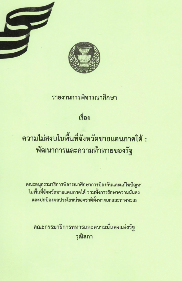 รายงานการพิจารณาศึกษา เรื่อง ความไม่สงบในพื้นที่จังหวัดชายแดนภาคใต้ : พัฒนาการและความท้าทายของรัฐ คณะอนุกรรมาธิการพิจารณาศึกษาการป้องกันและแก้ไขปัญหาในพื้นที่จังหวัดชายแดนภาคใต้ รวมทั้งการรักษาความมั่นคงและปกป้องผลประโยชน์ของชาติทั้งทางบกและทางทะเล คณะกรรมาธิการการทหารและความมั่นคงแห่งรัฐ วุฒิสภา / สำนักกรรมาธิการ 2 สำนักงานเลขาธิการวุฒิสภา.