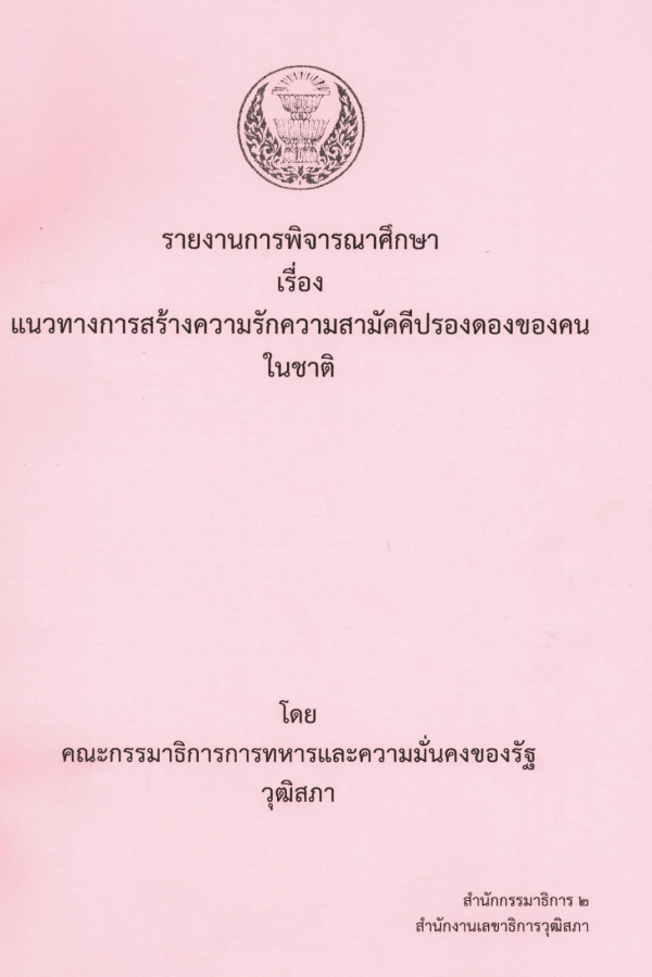 รายงานการพิจารณาศึกษา เรื่อง แนวทางการสร้างความรักความสามัคคีปรองดองของคนในชาติ โดย คณะกรรมาธิการการทหารและความมั่นคงของรัฐ วุฒิสภา / สำนักกรรมาธิการ 2 สำนักงานเลขาธิการวุฒิสภา.