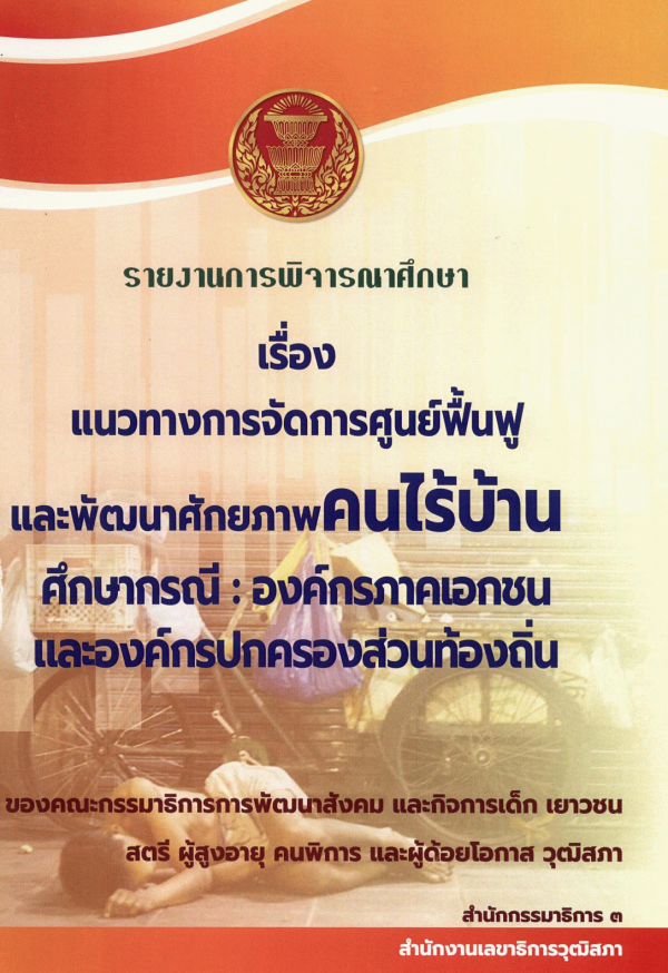 รายงานการพิจารณาศึกษา เรื่อง แนวทางการจัดการศูนย์ฟื้นฟูและพัฒนาศักยภาพคนไร้บ้าน ศึกษากรณี : องค์กรภาคเอกชน และองค์กรปกครองส่วนท้องถิ่น ของคณะกรรมาธิการการพัฒนาสังคม และกิจการเด็ก เยาวชน สตรี ผู้สูงอายุ คนพิการ และผู้ด้อยโอกาส วุฒิสภา / สำนักกรรมาธิการ 3 สำนักงานเลขาธิการวุฒิสภา.