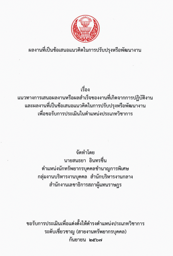 แนวทางการเสนอผลงานหรือผลสำเร็จของงานที่เกิดจากการปฏิบัติงานและผลงานที่เป็นข้อเสนอแนวคิดในการปรับปรุงหรือพัฒนางานเพื่อขอรับการประเมินในตำแหน่งประเภทวิชาการ / สนธยา อินทรชื่น.