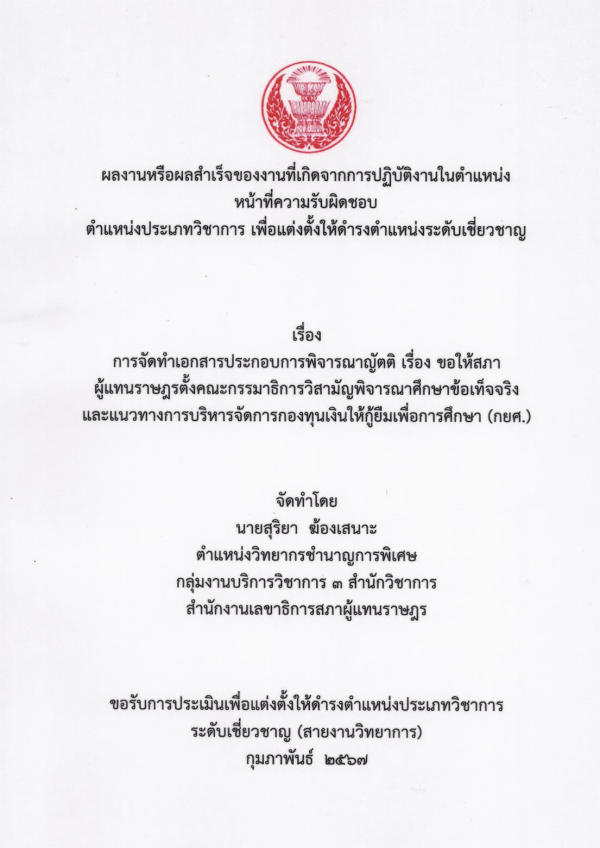 การจัดทำเอกสารประกอบการพิจารณาญัตติ เรื่อง ขอให้สภาผู้แทนราษฎรตั้งคณะกรรมาธิการวิสามัญพิจารณาศึกษาข้อเท็จจริงและแนวทางการบริหารจัดการกองทุนเงินให้กู้ยืมเพื่อการศึกษา (กยศ.) / สุริยา ฆ้องเสนาะ.