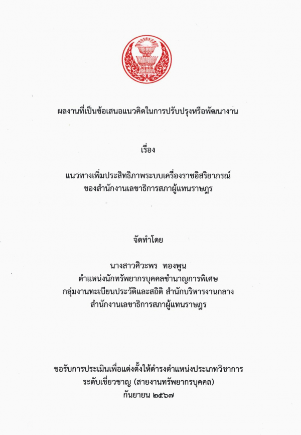 แนวทางเพิ่มประสิทธิภาพระบบเครื่องราชอิสริยาภรณ์ ของสำนักงานเลขาธิการสภาผู้แทนราษฎร / ศิวะพร ทองพูน.